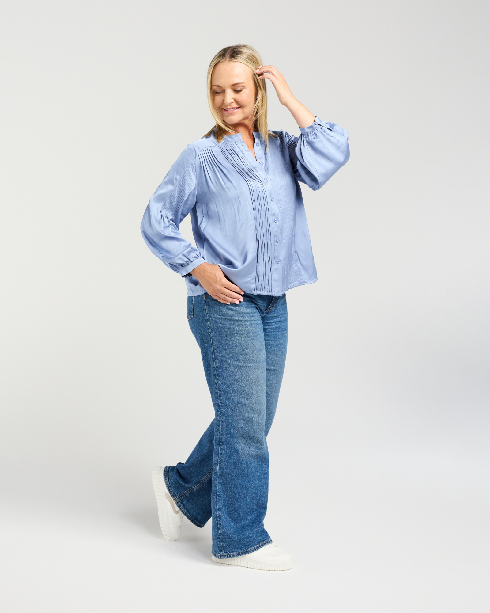 This button-down shirt features pleated details on the bodice and sleeves, with delicate trim around the arm cuffs and neckline. In a solid, elegant color, it offers a refined, versatile take on a classic silhouette.