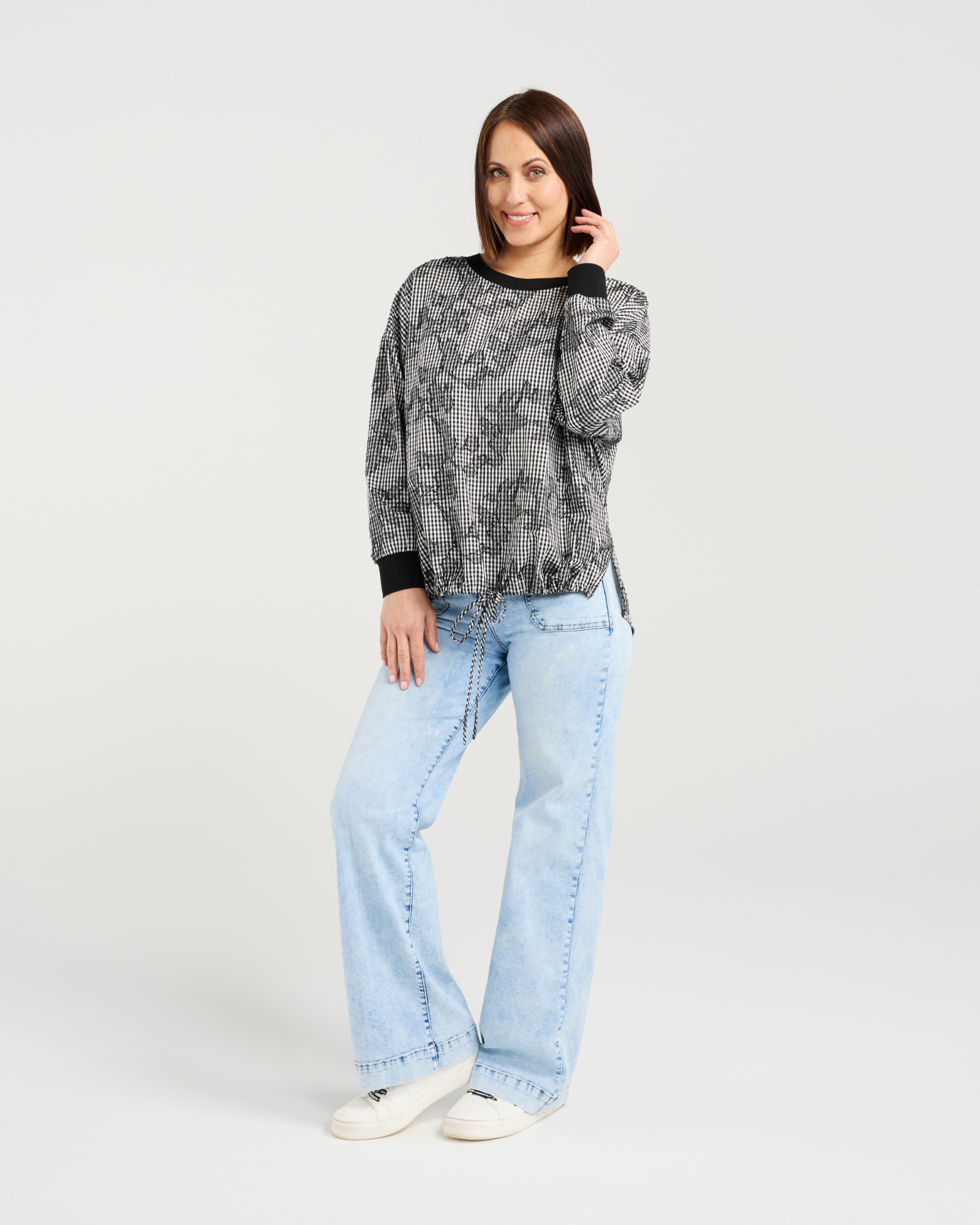 This long-sleeve top features elasticated arm cuffs, a slight side split, and a front hem drawstring for a relaxed, adjustable fit. Crafted in modern check fabric, it combines contemporary style with effortless comfort, perfect for winter layering.